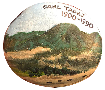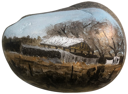 This shows the four separate paintings on each side of the miniature rock. The top left is near Mount Beirstadt. The top right is Debeque Canyon in Western Colorado. The bottom left is plateaus on I-25 in Wyoming. The bottom right is a falling down barn just north of Denver CO. Not For Sale. This type of Rock can be commissioned.